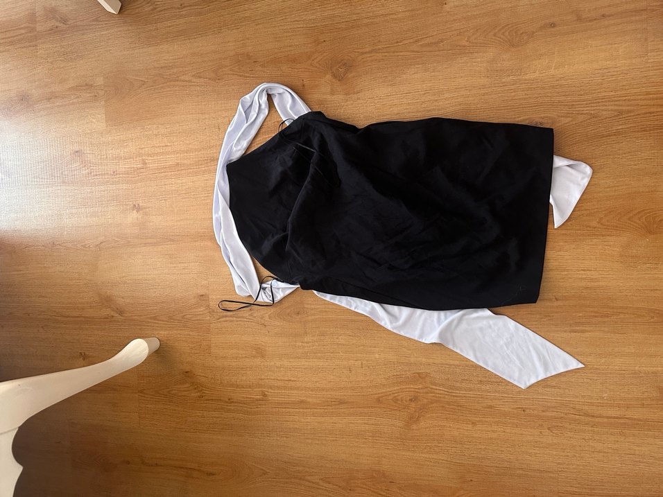 Siyah gövde ve beyaz bağcık detayına sahip mini elbise beyazına biraz siyahı soldu