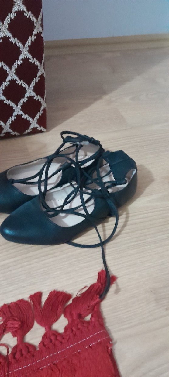 siyah renkte, bağcıklı tasarıma sahip kadın ayakkabısı. Kauçuk malzemeden üretilmiş, minimalist ve bohem tarzda, günlük kullanım için uygundur.