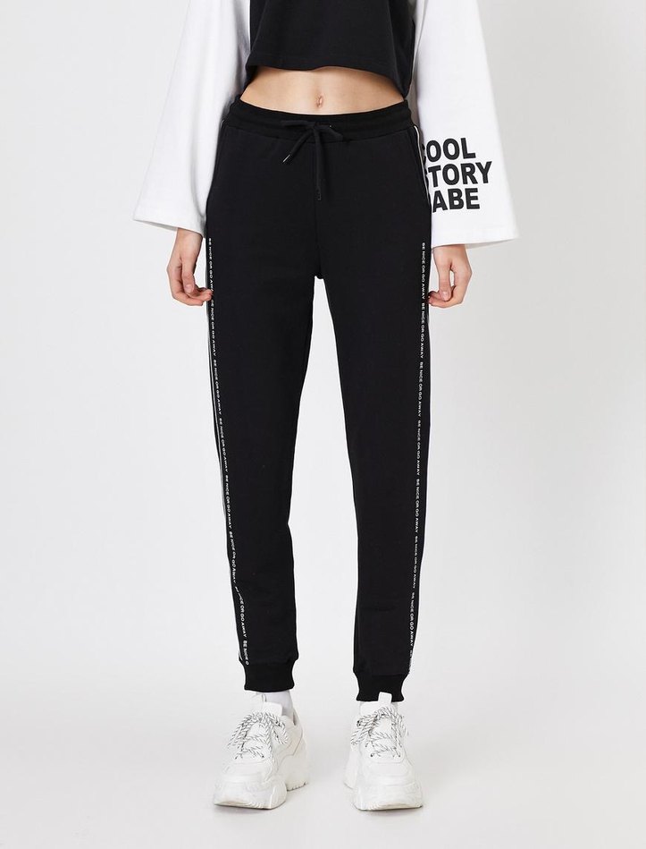 Bağcıklı bel ve yan şeritlerde yazı detaylı, bağlamalı siyah kadın eşofman altı. Sentetik kumaştan, günlük kullanım için rahat.