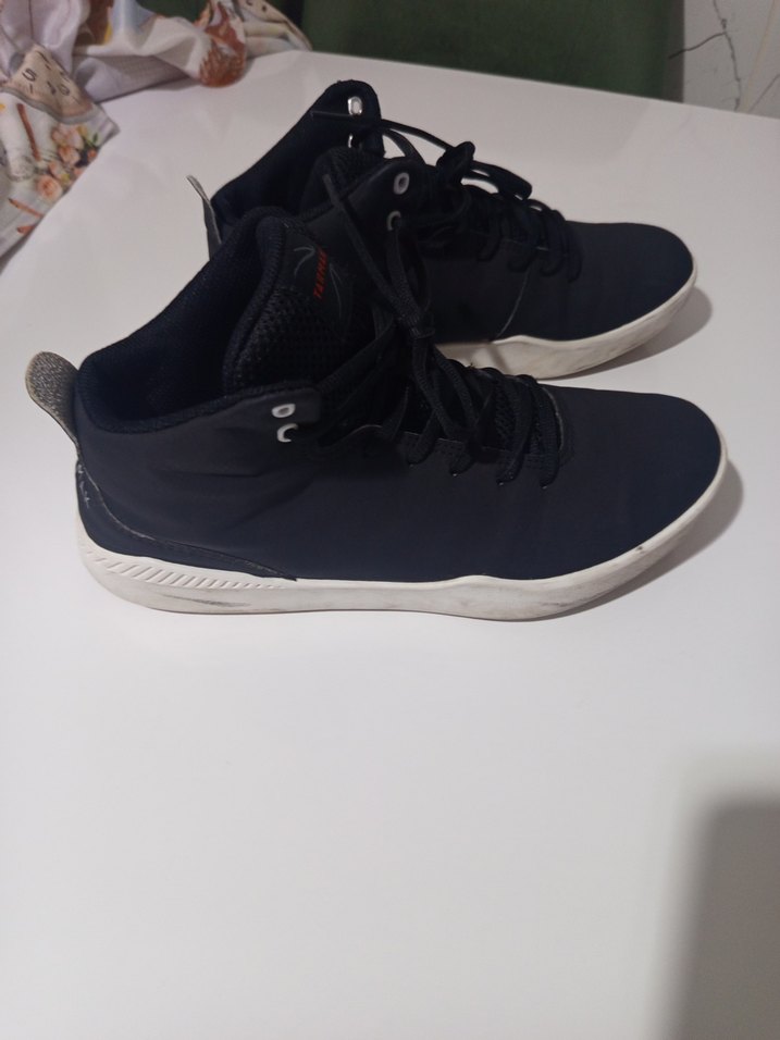 Spor ve günlük sokak stili için tasarlanmış, siyah bağcıklı ve kauçuk tabanlı basketbol ayakkabısı. Desensiz, koyu renk şık tasarım. Sıfır ayarında 1-2 kez giyildi.