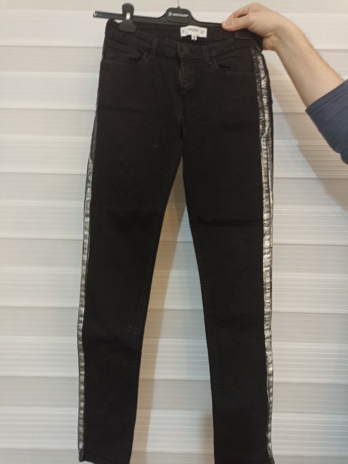 Siyah denim kot pantolon, regular fit ve midi boyda, bağcıklı ve yanlarda tie-dye desenli şerit detaylı. Günlük kullanıma uygun, sokak stiline uygun.