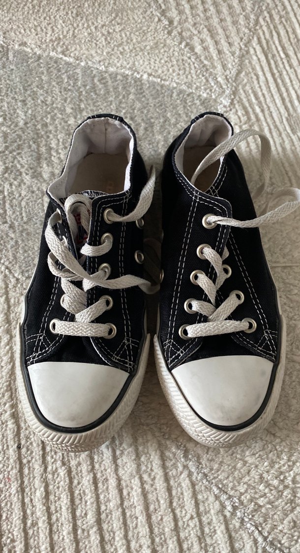 Siyah bağcıklı çocuk spor ayakkabılar, günlük kullanım için uygun, düz kauçuk tabanlı ve beyaz bağcıklıdır. Gri tonlu beyaz burun kısmı vardır.