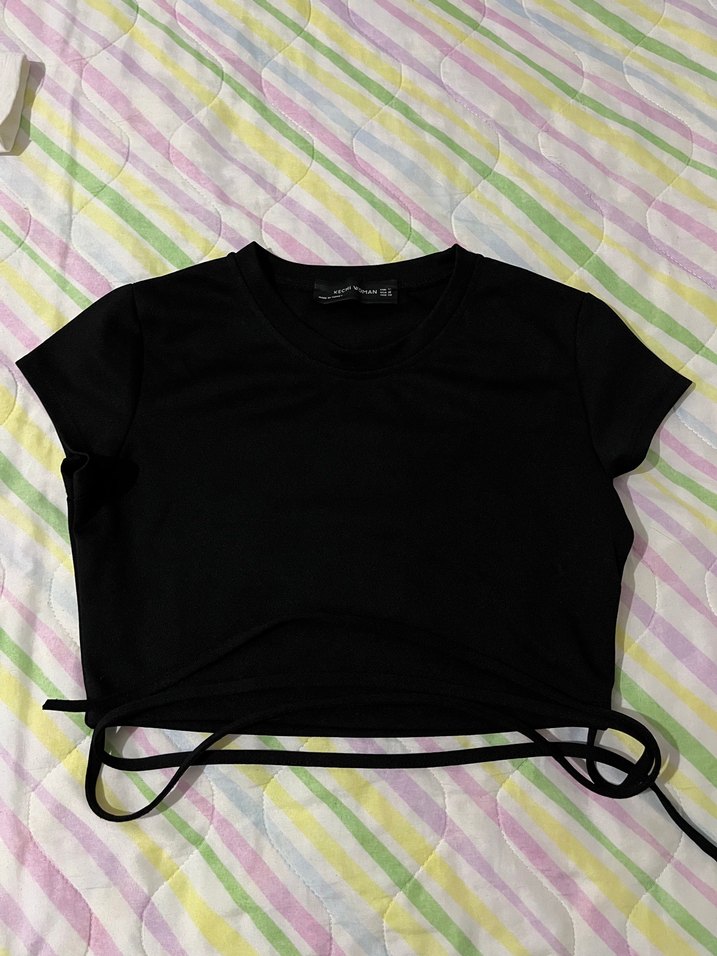 Siyah, bağcıklı ve tekne yaka detaylı, sıkı kesim crop top. Dış mekanlarda rahatlıkla kullanılabilen sentetik kumaştan.