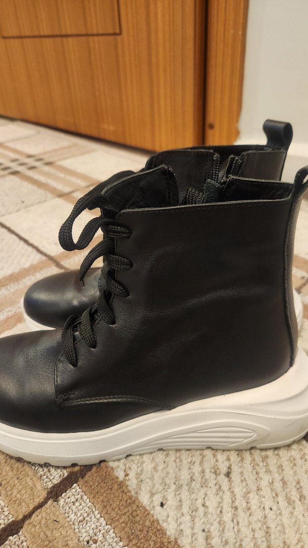Siyah kauçuk, bağcıklı ve dolgu topuklu kadın botları, gotik sokak tarzını yansıtarak günlük kullanıma uygun şık ve rahat bir görünüm sunar.