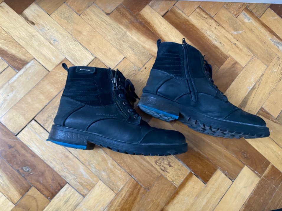 Siyah, bağcıklı ve yan fermuarlı erkek biker botları, kauçuk malzemeden yapılmıştır ve trend sokak stiline uygundur.