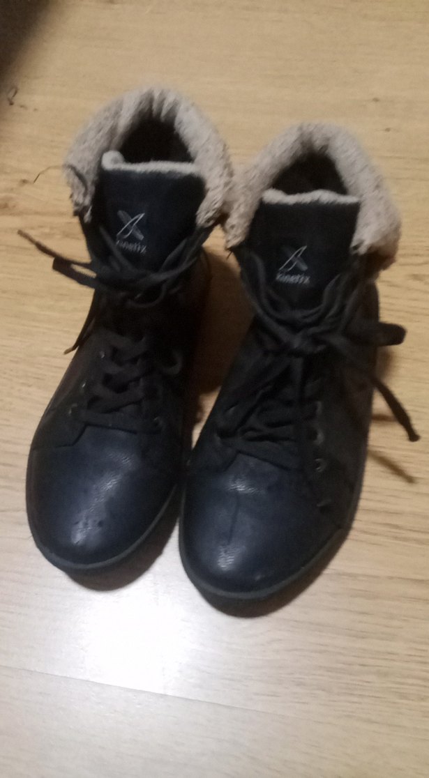 Siyah, bağcıklı erkek bot, içi peluş kaplı ve goth tarzında. Düz yüzeye sahip, soğuk havalar için uygun.