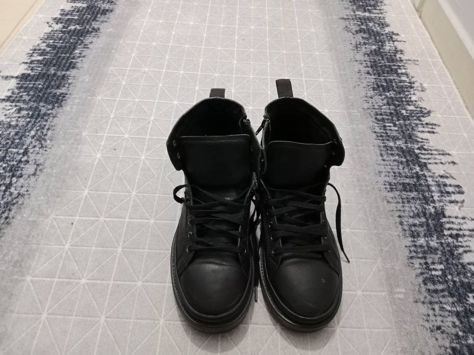 Siyah kauçuk erkek botlar, bağcıklı ve tokalı detaylara sahip. Gotik ve sokak stilini yansıtan, günlük kullanıma uygun koyu renkli model.