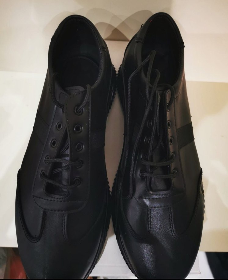 Siyah renkli, bağcıklı ve kauçuk tabanlı erkek günlük ayakkabısı, minimalist sokak giyimi tarzına uygundur. Markasını hatırlamıyorum