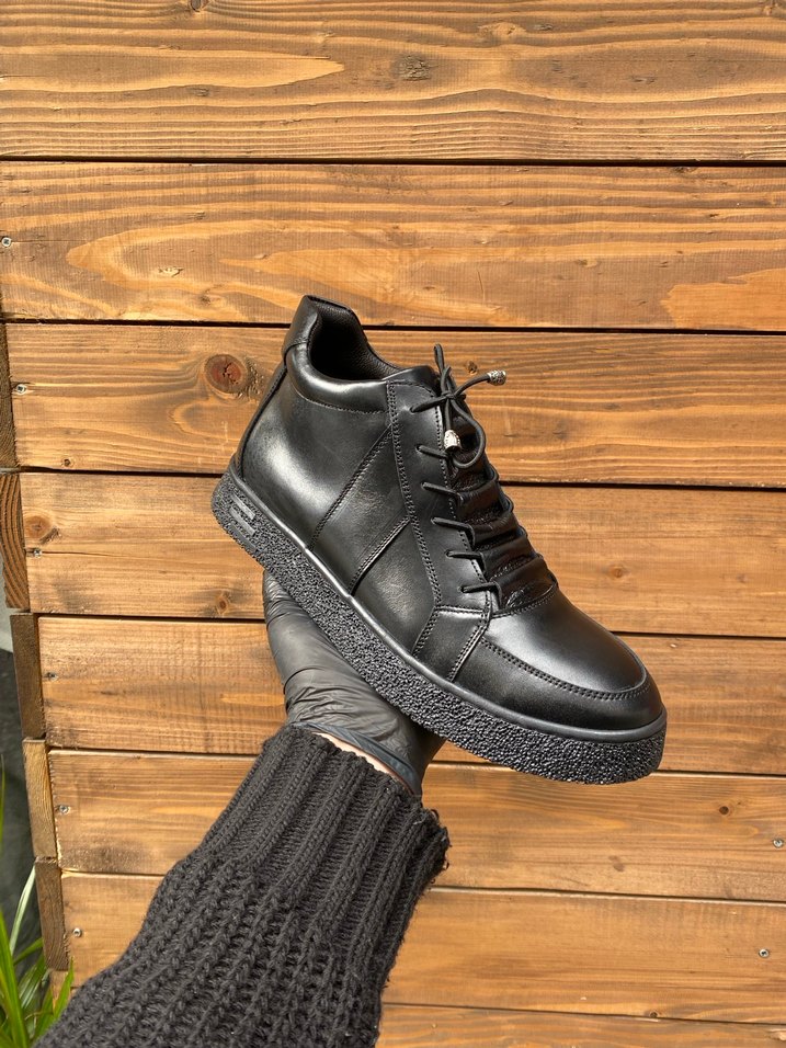 Siyah kauçuk malzemeden yapılmış, bağcıklı erkek botu. Günlük sokak stili için uygun, desensiz ve dayanıklı. Numaraları mevcuttur