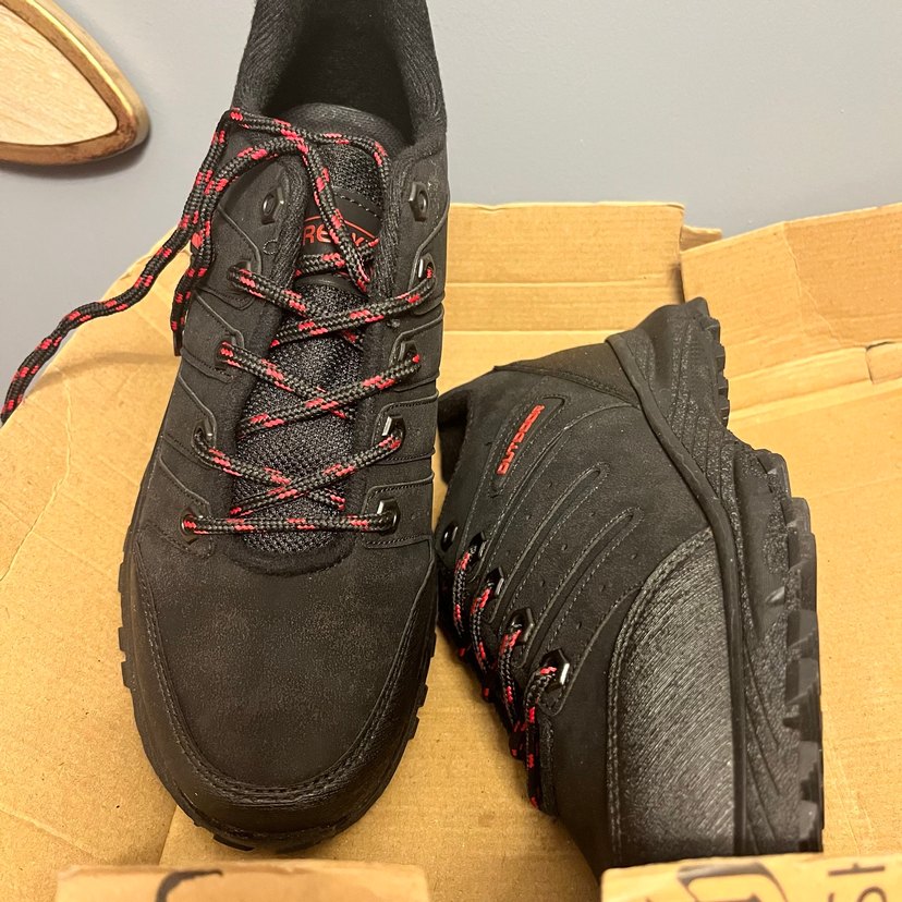 Kauçuk tabanlı, kırmızı detaylı bağcıklarla siyah erkek outdoor ayakkabısı, trend sokak stiline uygun.