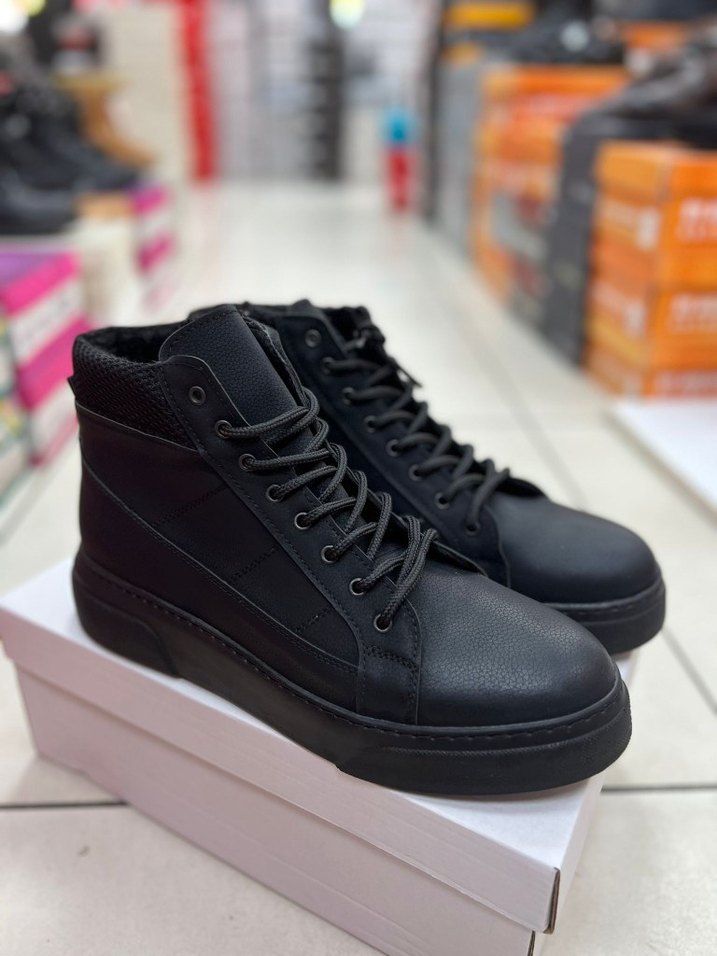 Siyah renkte, bağcıklı erkek botları. Desensiz, dayanıklı tabanıyla sokak stili için uygun.