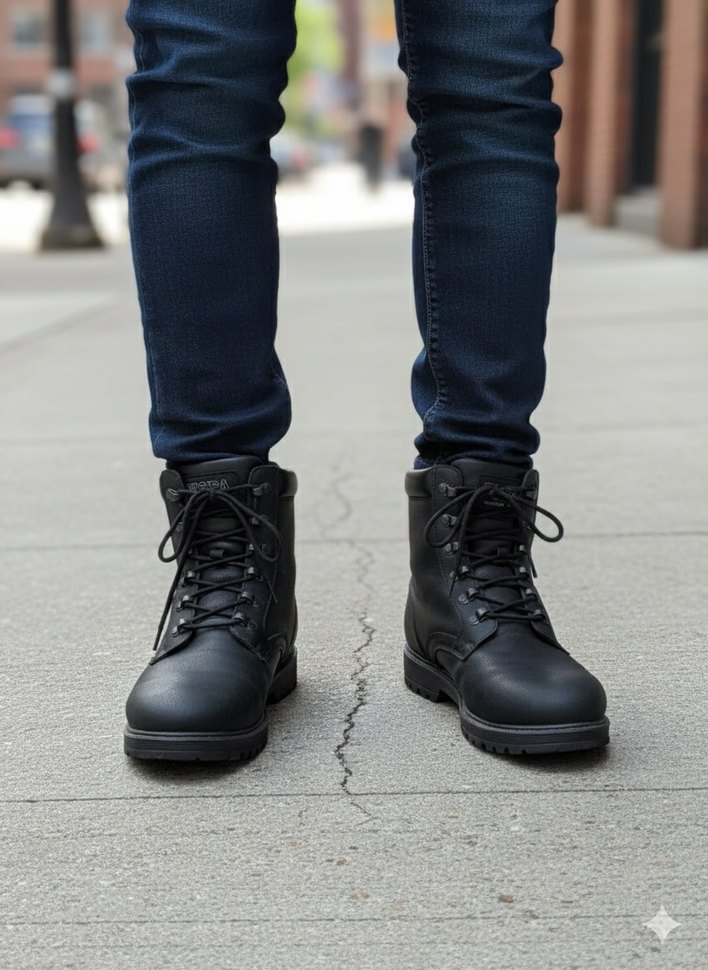 Siyah bağcıklı erkek botları, kauçuk malzemeden üretilmiş, günlük sokak stiline uygun rahat tasarım. Desensiz ve koyu renklidir. çok saglam bot