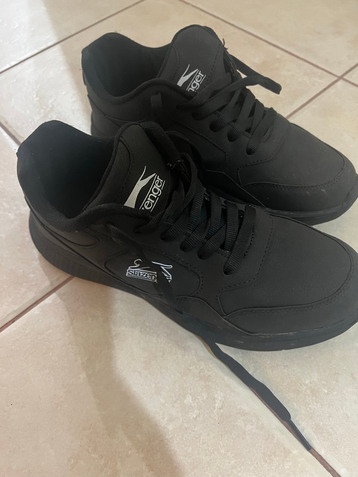 Siyah, bağcıklı ve ince topuklu kadın spor ayakkabısı, kauçuk tabanlı, spor ve günlük kullanım için uygundur.