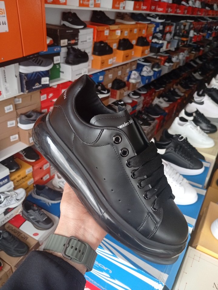 Siyah bağcıklı erkek spor ayakkabı, dayanıklı kauçuk malzeme ve kalın tabanıyla spor ve günlük sokak stili için uygundur.