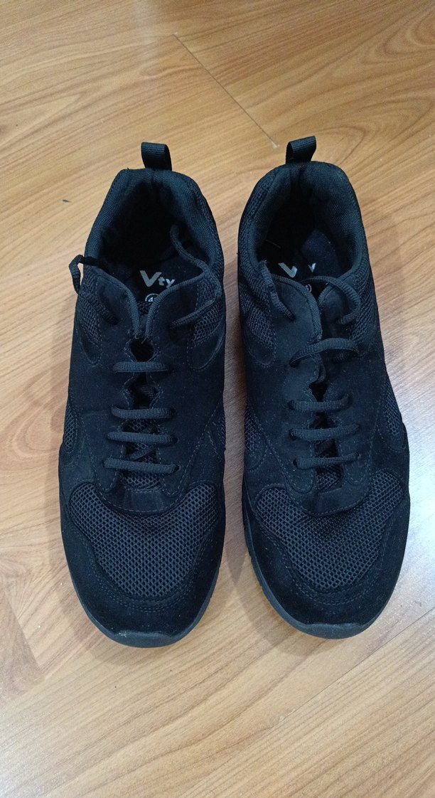 Siyah bağcıklı, kauçuk tabanlı kadın spor ayakkabısı. İnce topuklu ve sokak stiline uygun tasarım. 45,46 beden.