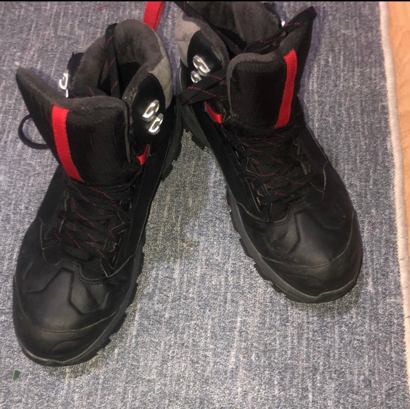 Siyah bağcıklı erkek spor botları, kauçuk tabanlı, koyu renkli streetwear tarzında ve rock punk havasında. Spor ve günlük kullanım için uygundur. Su geçirmez dechatlon 44 numaradır 2 kez giyildi geçen kış