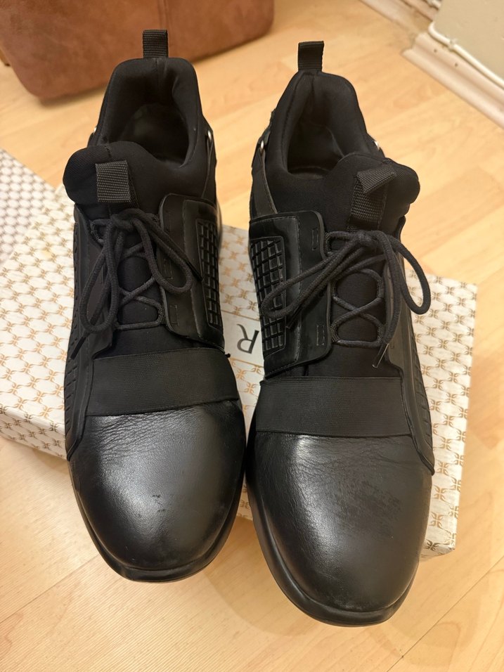Siyah bağcıklı erkek spor bot, athleisure ve street wear tarzına uygun sade tasarımlı, rahat ve modern. Biraz tabanında defosu var minik bir tamirle halledilebilir