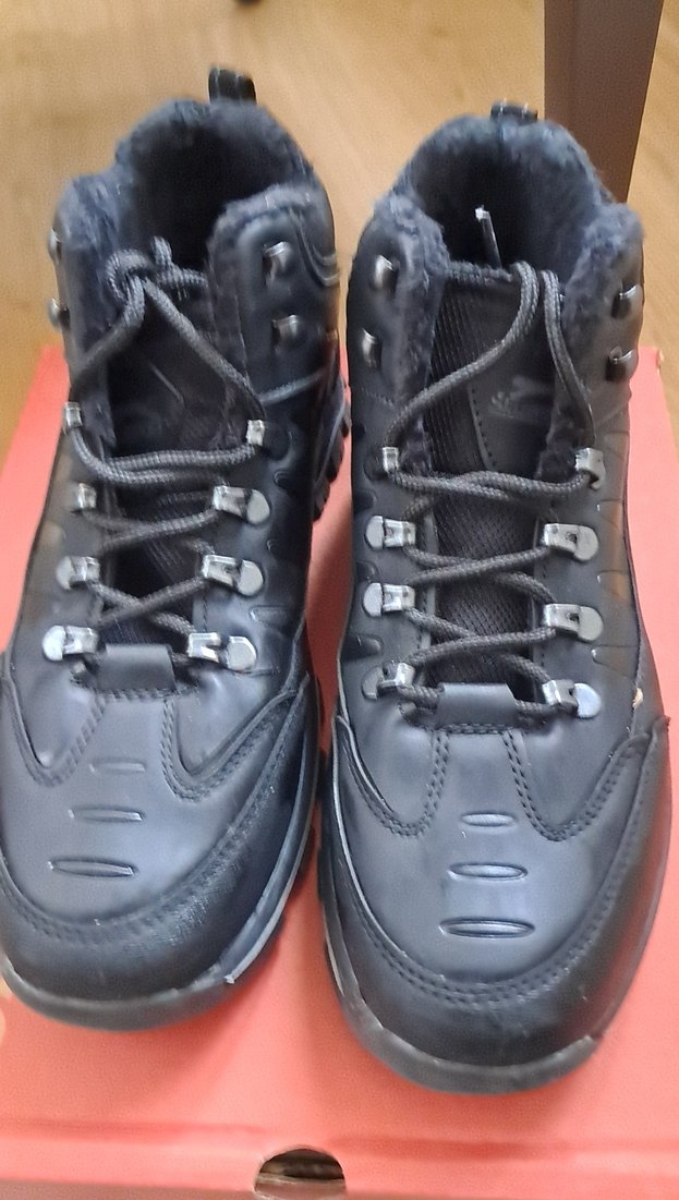 Siyah renkte, bağcıklı, kauçuk malzemeden yapılmış erkek spor botu. Koyu ve desensiz tasarıma sahip, biker stilinde, trend ve rahat kullanım için uygun. az kullanılmış