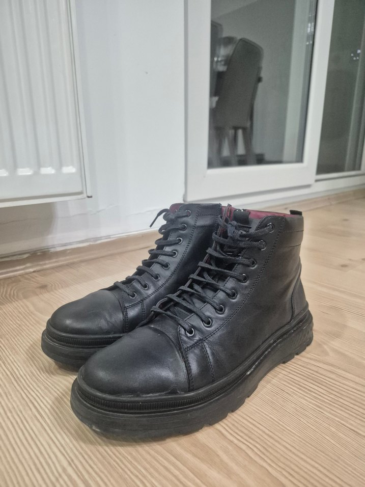 Siyah bağcıklı, kauçuk malzemeden yapılmış erkek botları. Desensiz tasarımıyla günlük sokak stiline uygun, rahat ve trend görünümlü.
