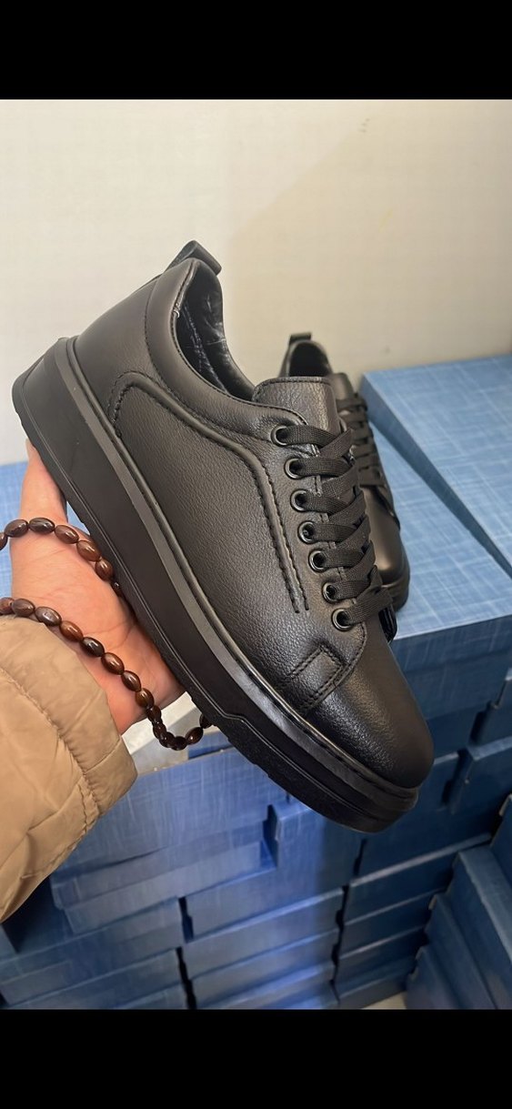 Hakiki deri siyah, bağcıklı, poli tabanlı erkek spor ayakkabısı. Düz yüzeyli günlük ve sokak stiline uygun rahat tasarım elimizde 40 numara hariç her numaralar var.