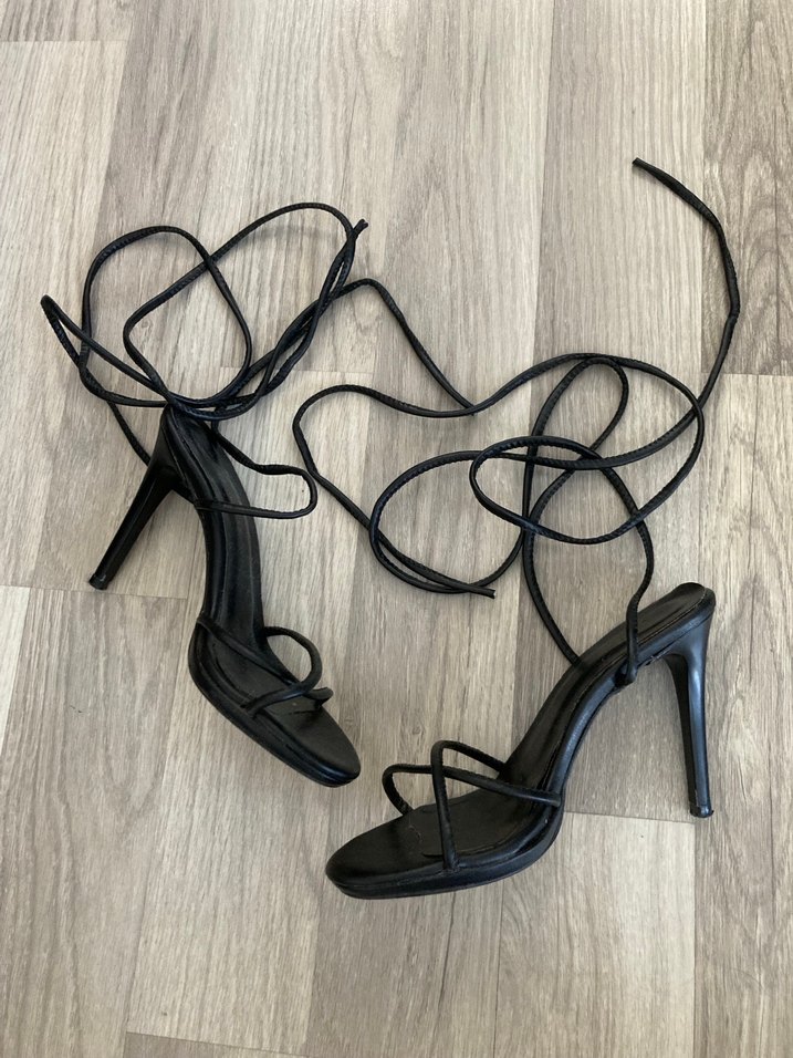 Minimalist gotik tarzda siyah yılan desenli, ince topuklu ve bağcıklı stilettolar. Romantik akşamlar için uygundur.