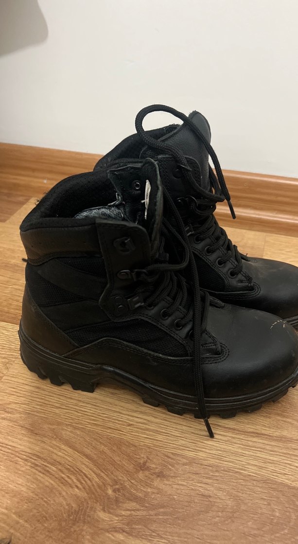 Dış mekan kullanıma uygun, kauçuk malzemeden yapılmış, bağcıklı ve tokalı siyah erkek goth botları, grunge punk tarzında.