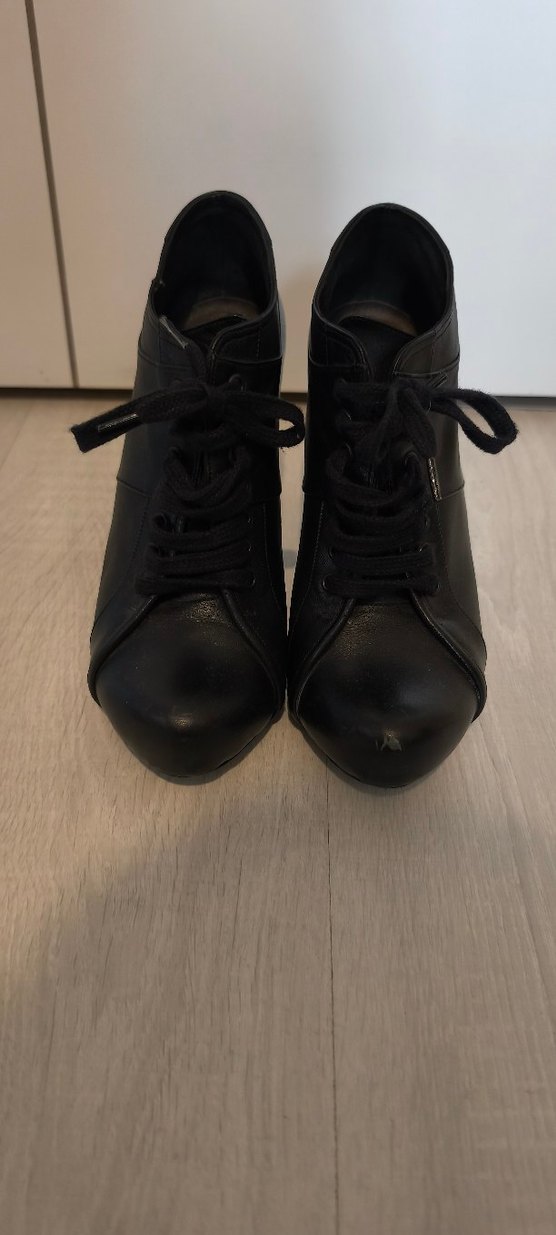 Desa marka, 38 numara, az kullanılmış rahat platform topuklu ayakkabı. Siyah bağcıklı, dolgu topuklu, deri ayakkabı. Romantik akşamlar için uygun, desensiz ve koyu renkte.