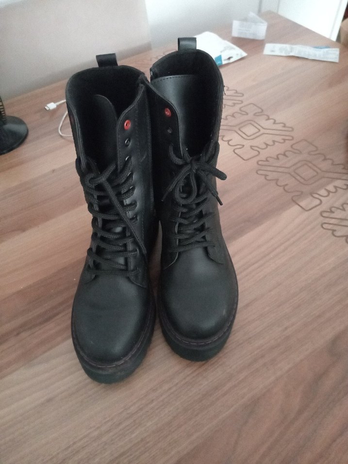 Siyah kauçuk malzemeden, bağcıklı ve stiletto topuklu gotik tarzda kadın botları. Koyu renkte ve desensiz, rock punk havası taşıyor.