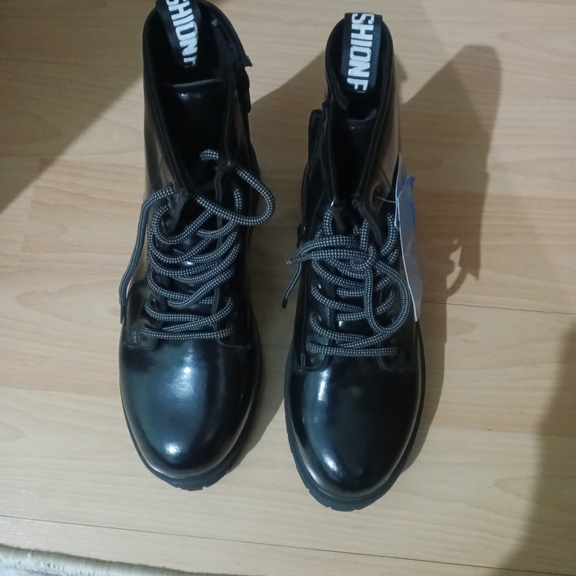 Siyah kauçuk malzemeden yapılmış, bağcıkli bot