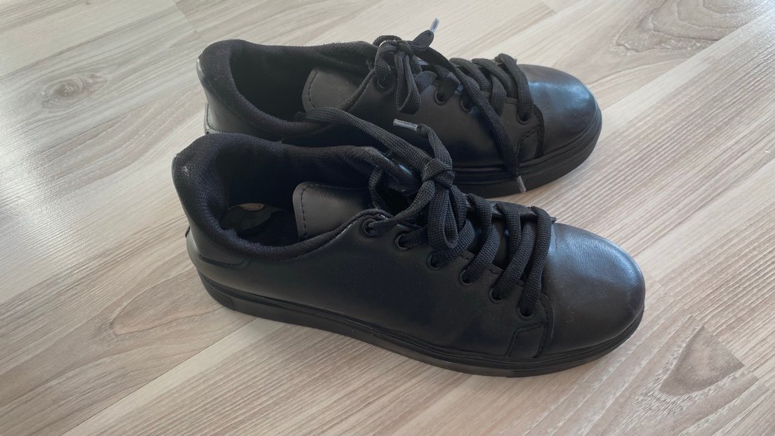 Siyah bağcıklı ve ince topuklu, kauçuk malzemeden yapılmış kadın spor ayakkabısı. Trendy casual ve streetwear tarzına uygun, günlük kullanıma elverişli. Bir ya da iki defa kullandım