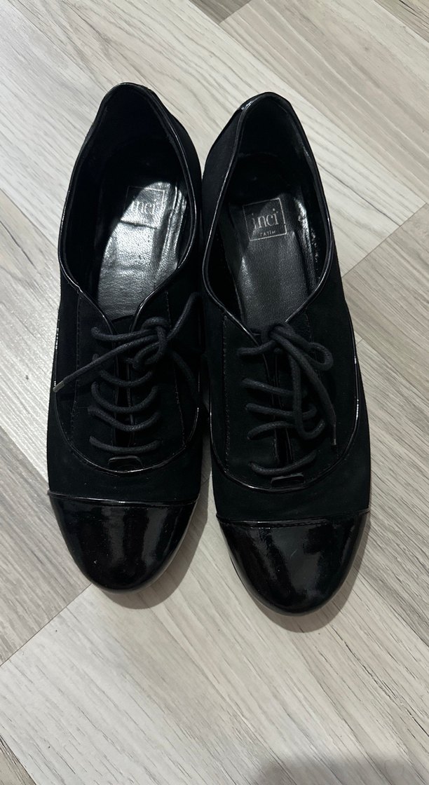 Siyah bağcıklı, kadın ayakkabısı. Klasik ve gotik tarzı birleştirir, parlak burun kapaklı kauçuk malzeme. Ofise uygun.