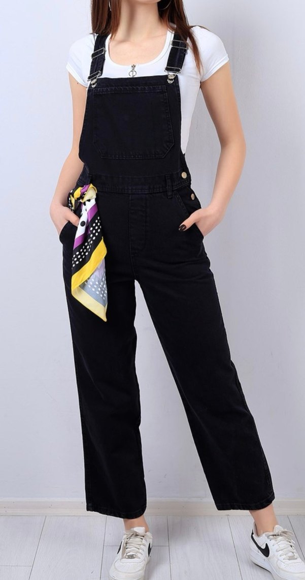 Siyah Bağcıklı Kadın Denim Tulum