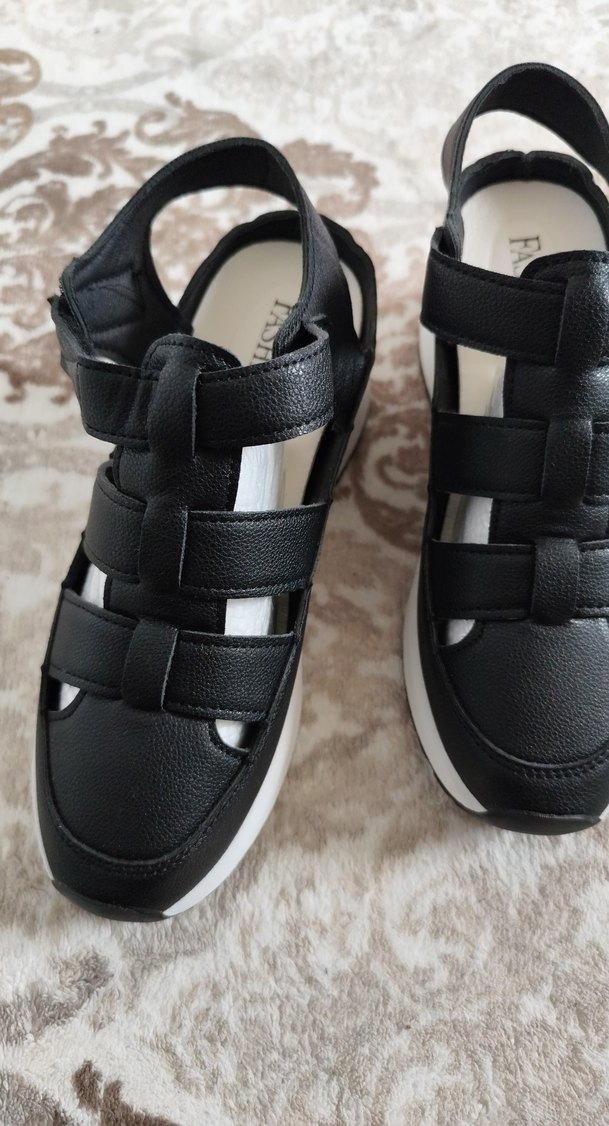 Siyah renkte, kauçuk malzemeden üretilmiş, yapışkanlı kayışlara sahip dolgu topuklu kadın sandalet. Trendy ve rahat sokak stili için uygundur. bir defa giyildi