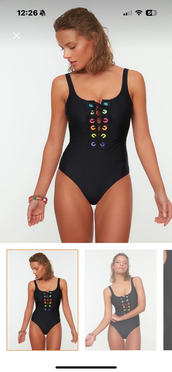 Siyah, bağcıklı ve düğmeli ön kısmı renkli tie-dye detaylı, atletik ve bohem tarzı kadın mayo.sayılı giyildi bir kusuru yok