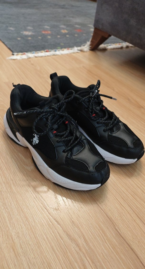 Siyah bağcıklı kadın spor ayakkabısı, stiletto topuklu ve kauçuk tabanlıdır. Spor ve sokak giyimi tarzına uygundur. sadece on kısma ufak bır surtme olmus