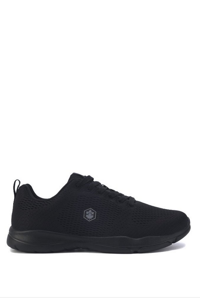 Siyah renk, bağcıklı kadin spor ayakkabısı. Kauçuk tabanlı, desen içermeyen ve rahat bir tasarıma sahip. Spor ve günlük kullanıma uygun.
