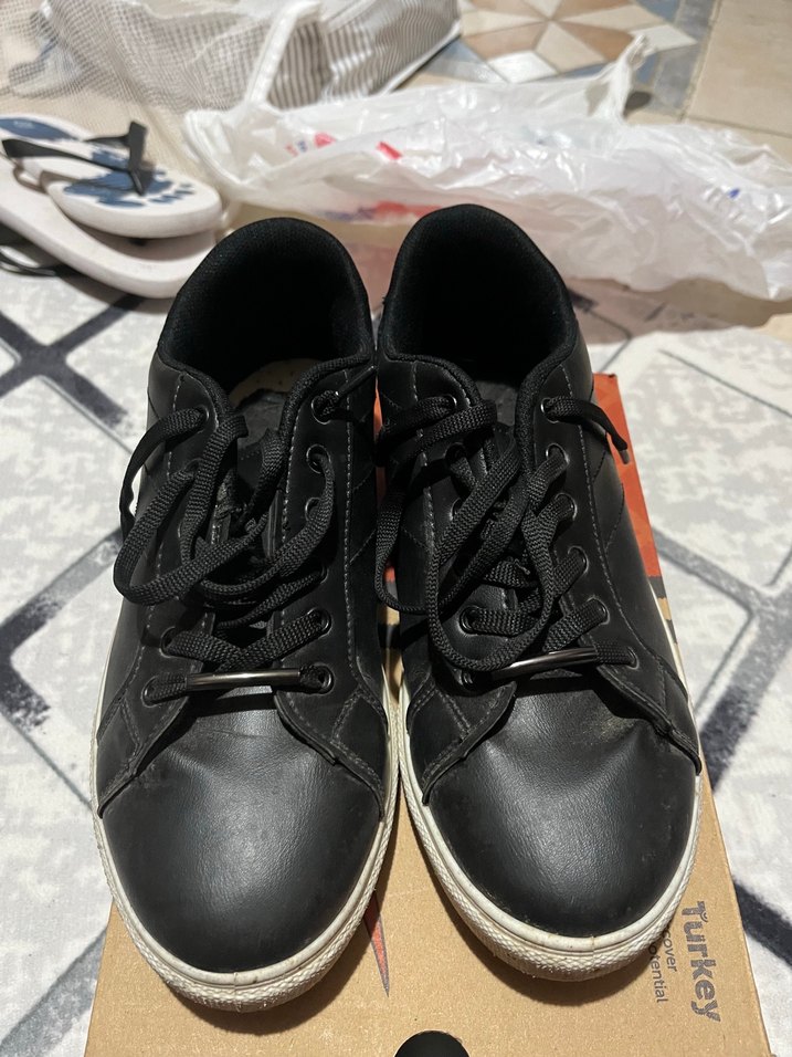 Siyah, bağcıklı ve tokalı kadın spor ayakkabısı. Lastik tabanlı, günlük kullanıma uygun sade tasarım. 39 numara