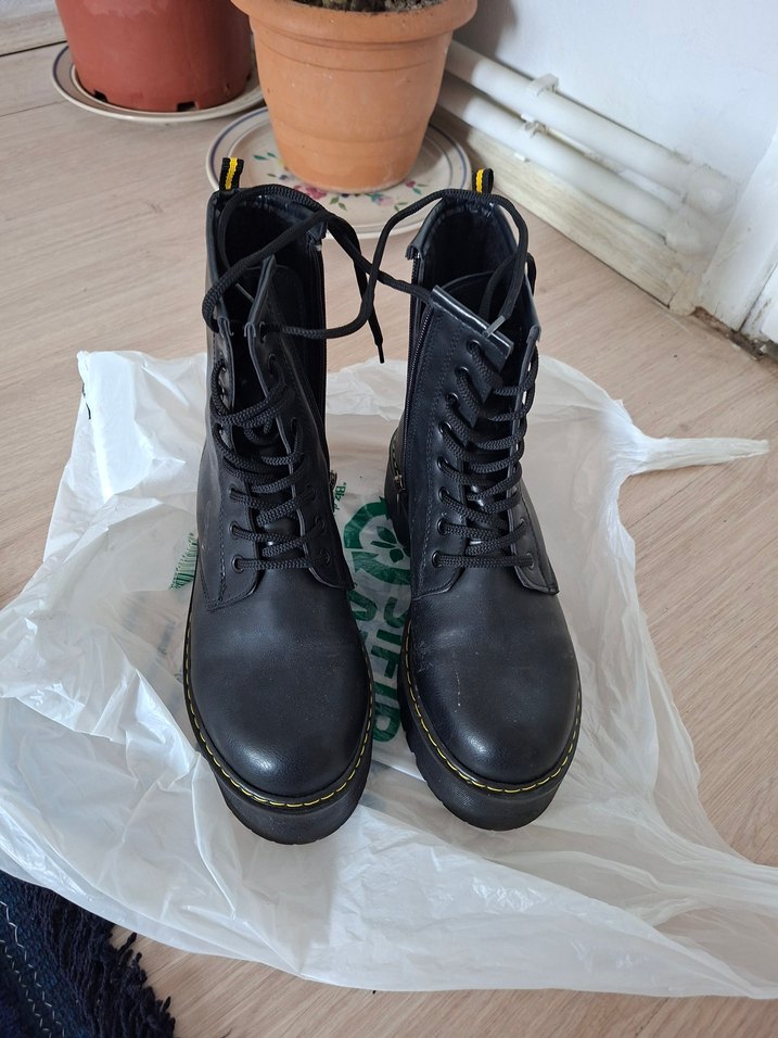 Siyah bağcıklı kadın botları, stiletto topuklu ve lastik malzemeden. Tokalı detaylara sahip, günlük kullanıma uygun goth punk tarzında. kullanılmamiştır sıfır bot bol geldiği için satılık