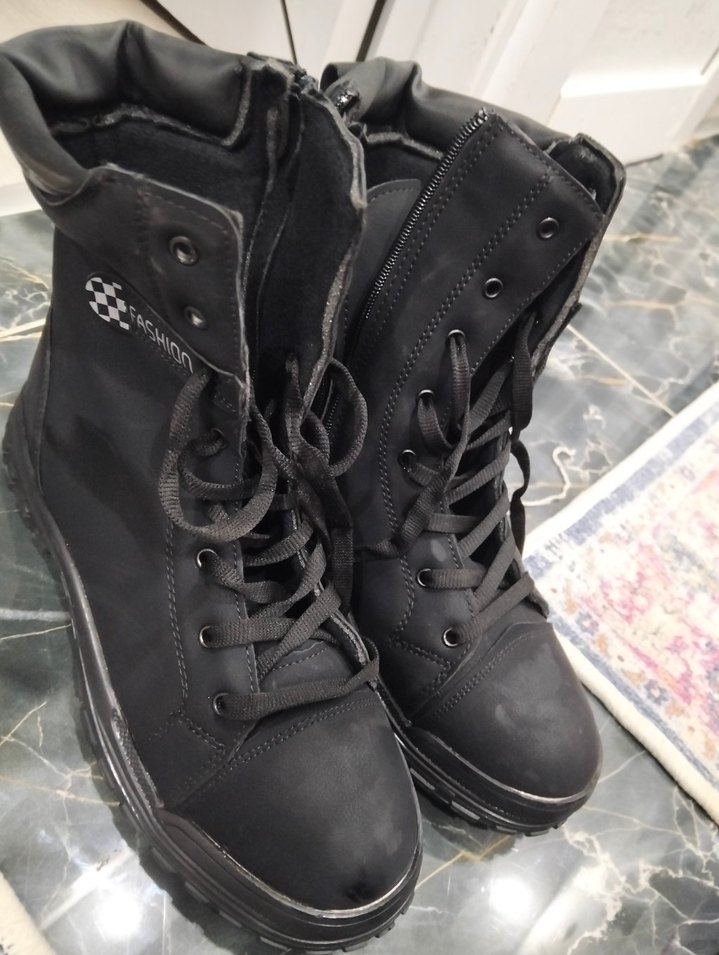 Siyah kauçuk malzemeden yapılmış, bağcıklı ve fermuarlı erkek botları. Koyu kamuflaj desenli, gotik sokak stili ve rock punk havasında.