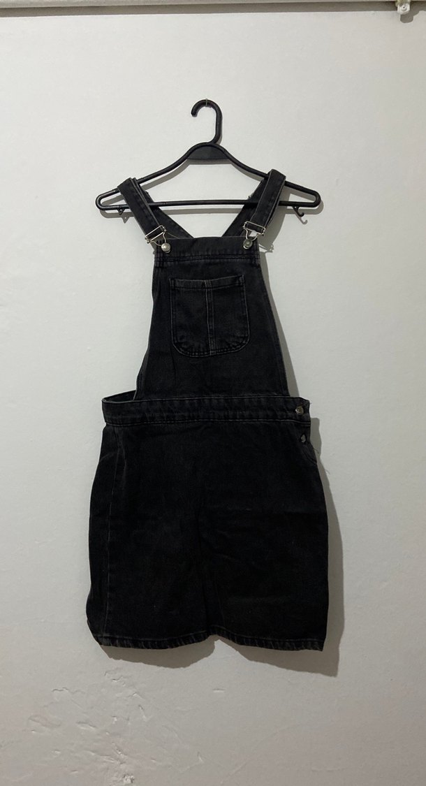 Siyah bağcıklı askılı, yüksek yakalı, midi uzunlukta, fitted kesim denim kısa salopet. Grunge punk tarzına uygun.