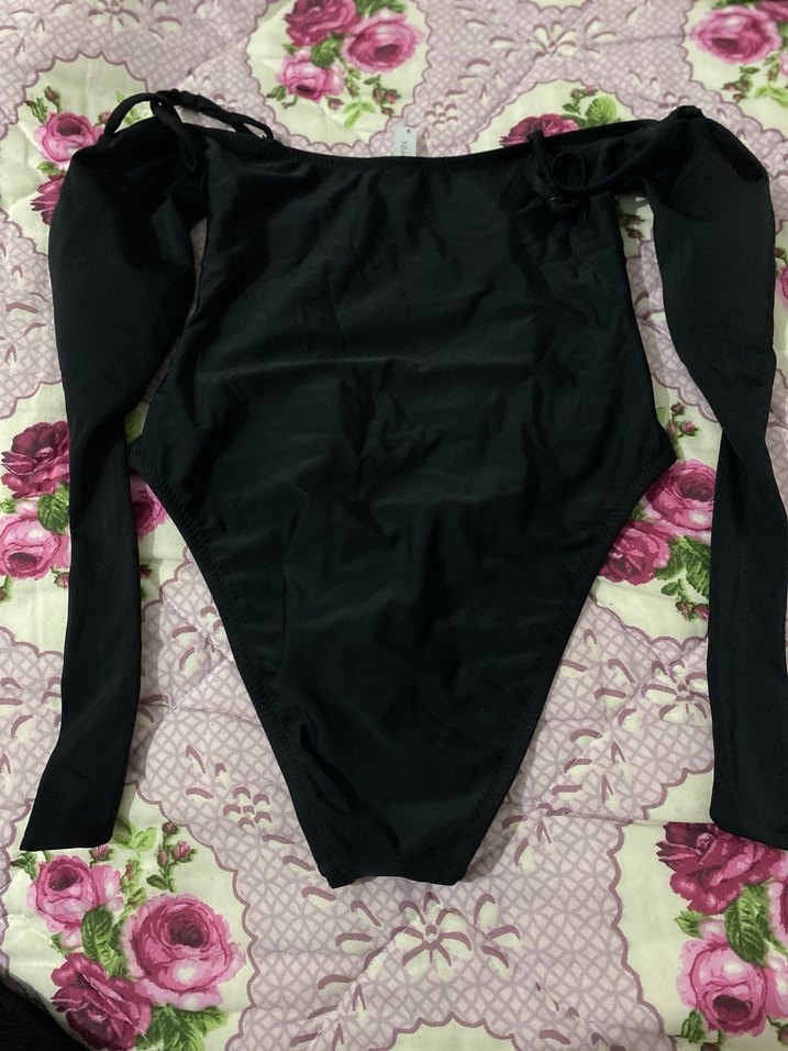 Siyah bağcıklı kolları ve fırfır detayları olan, koyu tie-dye desenli, gotik avant-garde tarzda, vücuda oturan midi mayo. ️