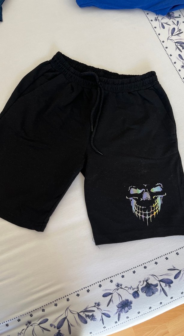 Bağcıklı, bol kesim siyah mini şort, tie-dye kafatası desenli ve fermuarlı ceplidir. Sentetik kumaştan, dış mekan kullanımı için uygundur.