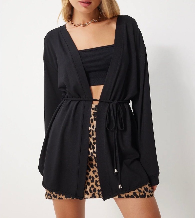 Siyah, salaş kesim, uzun kollu, belden bağlamalı, minimalist tarzda kısa kadın hırka. Ön sipariştir renk seçenekleri vardır yazarsanız yardımcı olurum