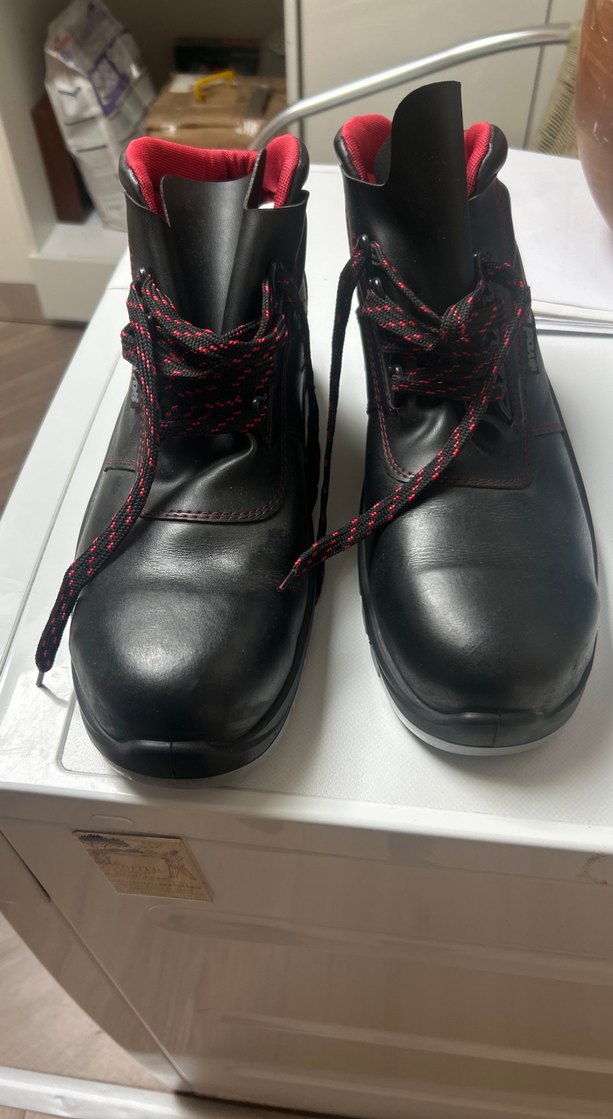 Siyah kauçuk malzemeden yapılmış, kırmızı detaylı bağcıklı minimalist gotik tarzda erkek botları.