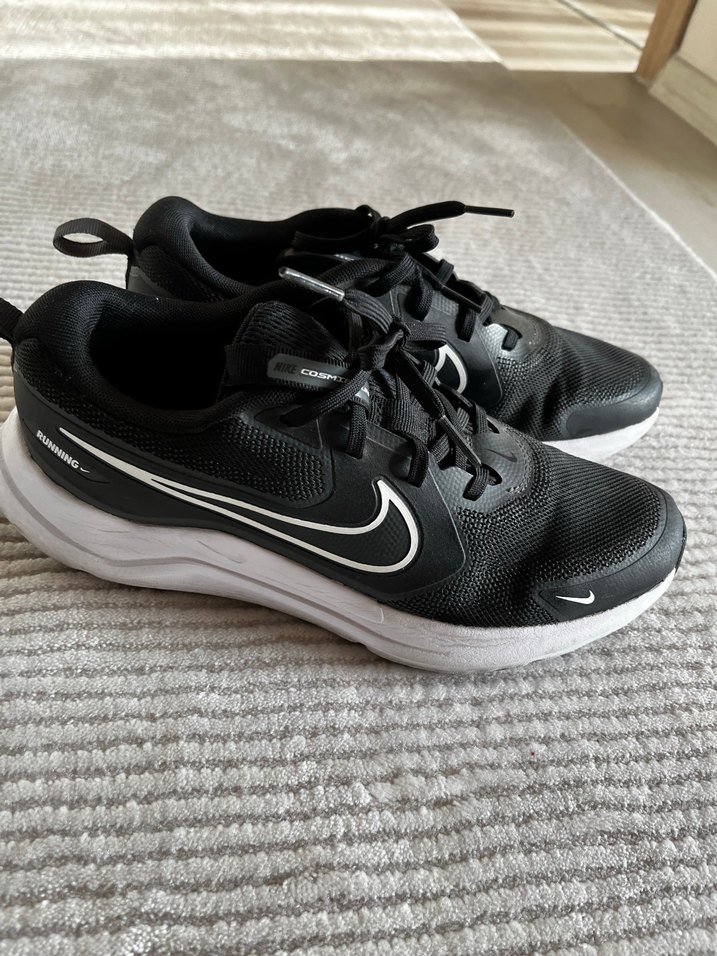 Siyah bağcıklı Nike kadın spor ayakkabısı, stiletto tarzı taban ve sade tasarımıyla sokak modasına uygun.