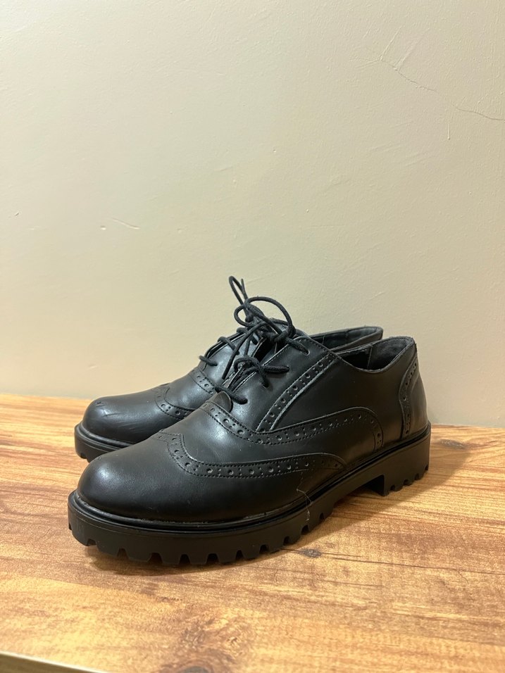 Gardırobunuzun vazgeçilmez parçası olacak,hem şık hem de rahat siyah bağcıklı ayakkabı.Klasik brogue (delikli) detayları ve tırtıklı/kalın tabanı sayesinde günlük kullanımda ve özel kombinelerinizde rahatlıkla kullanabilirsiniz. İyi durumdadır sadece burun kısımlarında fotoğrafta görebileceğiniz hafif çizikler/sürtünme izleri mevcut. Tabanda herhangi bi aşınma yoktur. Temizlenip cilalanarak kolaylıkla giderilebilir izlerdir. Not : 38 numara ama kalıbı dardır taraklı ve geniş ayaklara uygun değildir.