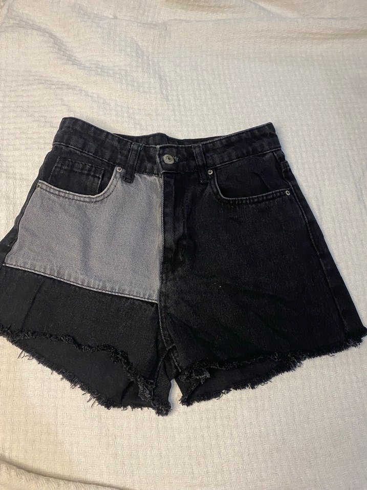 Siyah, bol kesim mini denim şort, bağcıklı detaylı ve parçalı batik desenli, günlük sokak stiline uygun.