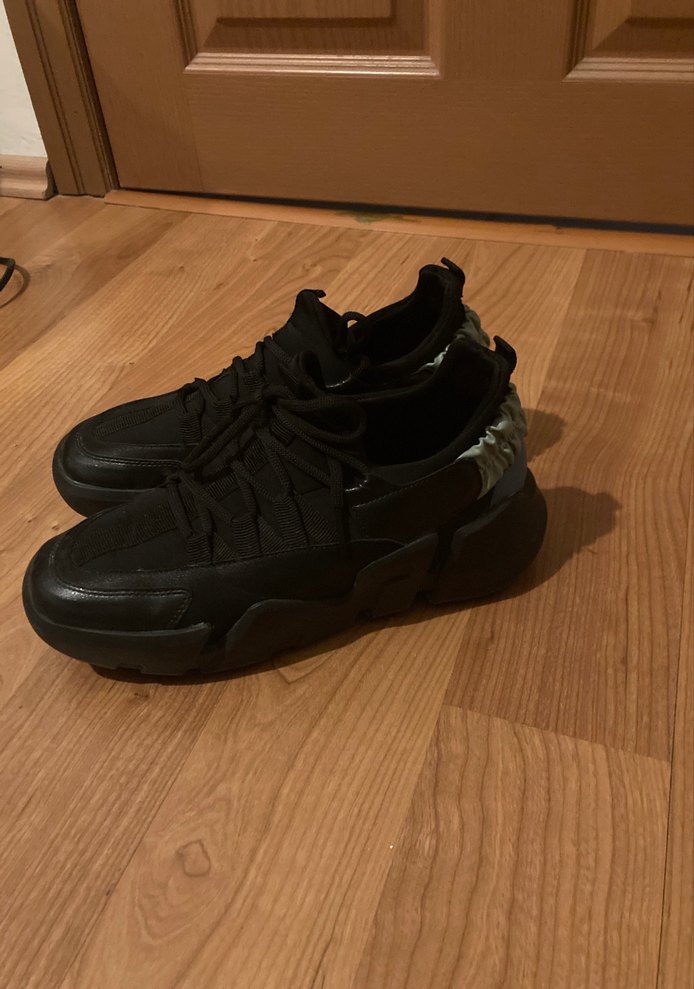 Spor ve sokak stiline uygun, kauçuk tabanlı siyah bağcıklı platform spor ayakkabılar. Trendy ve rahat bir görünüm sağlar.