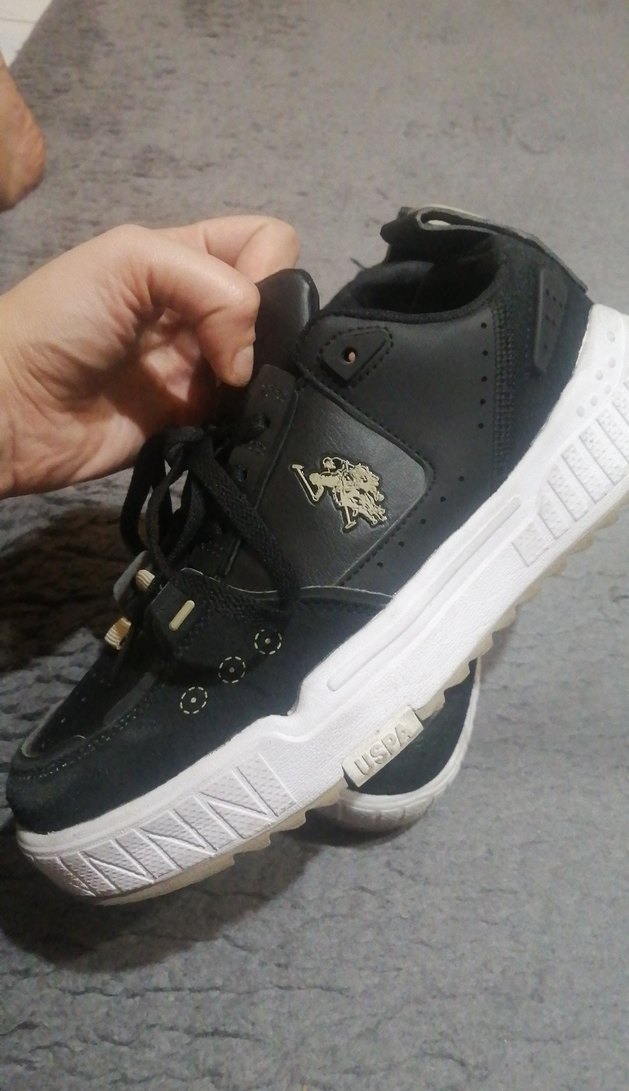 Siyah bağcıklı spor ayakkabı, platform topuk ve baskılı detaylara sahip. Kauçuk tabanlı, spor ve günlük sokak stili için uygun, rahat ve trend athleisure tarzı.