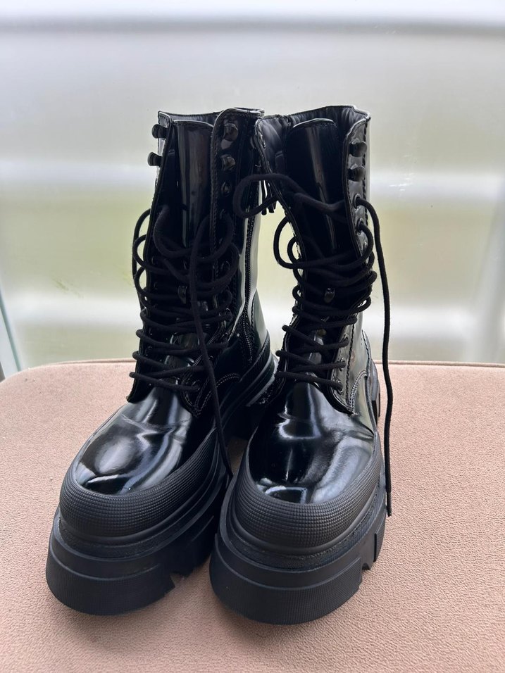 Siyah parlak görünümlü kauçuk kadın botları, Bershka ...bağcıklı ve platform topuklu, gotik tarzda günlük kullanıma uygun.